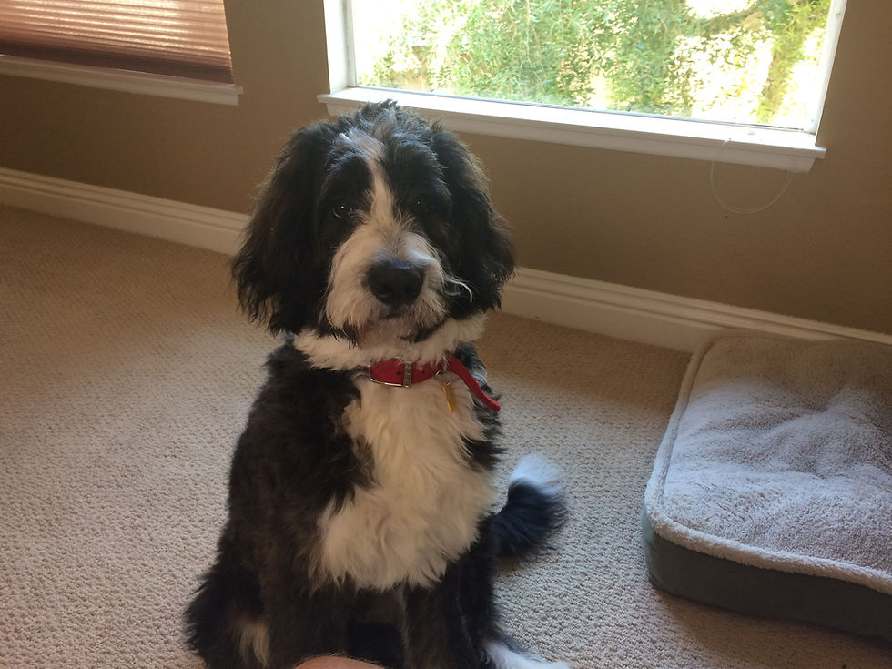 About Toby, he is the most wonderful creature we could ever have as our family member. He stole my heart on the plane ride home from Fort Wayne and Diane's as soon as she saw him. He owns us both, even when he eats a shoe or a pair of glasses. He is so very smart and came to us a very social dog. He believes that everyone wants to meet him and that all dogs are his friends. He has an incredible appetite and like all puppies he eats leaves, berries, trash and more on his walks if we aren't watching. He weighs about 56 lbs and is 2 ft tall at the haunches and about 30 inches to the top of his head. He'll be 6 months in 12 days. He has his first puppy training class tomorrow night, but he knows sit, shake a paw and stay (a little). Like most pups he jumps too much but is learning to heel on his twice daily walks. He's my constant companion and already we don't know what we'd do without him. To say we love Toby isn't close to our enormous affection. He's our boy. Thanks for being great to Toby before we met him. His mom and you helped him to be ready for the transition to CA. Our grandkids love him dearly but are glad he's outgrowing the tendency to chew on them. He loves kids. We'll send you more candid pictures in the next weeks. Again, our gratitude for giving us such a loving pup. Best regards, Mike and Diane W.